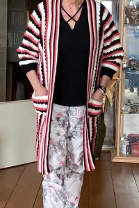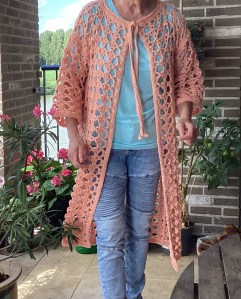 De maten zijn 36/40 42/46 48/52. Breedte op de rug 54 60 66 cm. Lengte 90 100 110 cm. Als je de lengte wilt aanpassen, kun je de onderste rij grannies weglaten of voor een heel lang vest een rij toevoegen.
