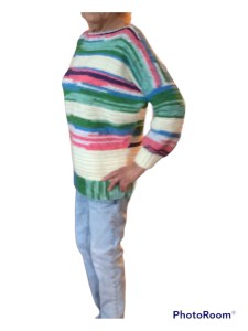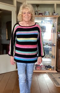 Tot de armsgaten haak je in het rond, daarna splits je voor voorpand en rugpand en de mouwen worden van boven naar onder aan de panden gehaakt. De trui zit dan al bijna in elkaar.