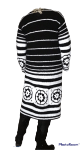 De basis van het patroon zijn rijen grannies. Je kunt kiezen uit 3 lengtes: 80 100 120 cm. Kies voor het aantal grannies: 4 5 of 6 stuks per rij. Het vest op de foto is ca 100 cm, dus 5 grannies.