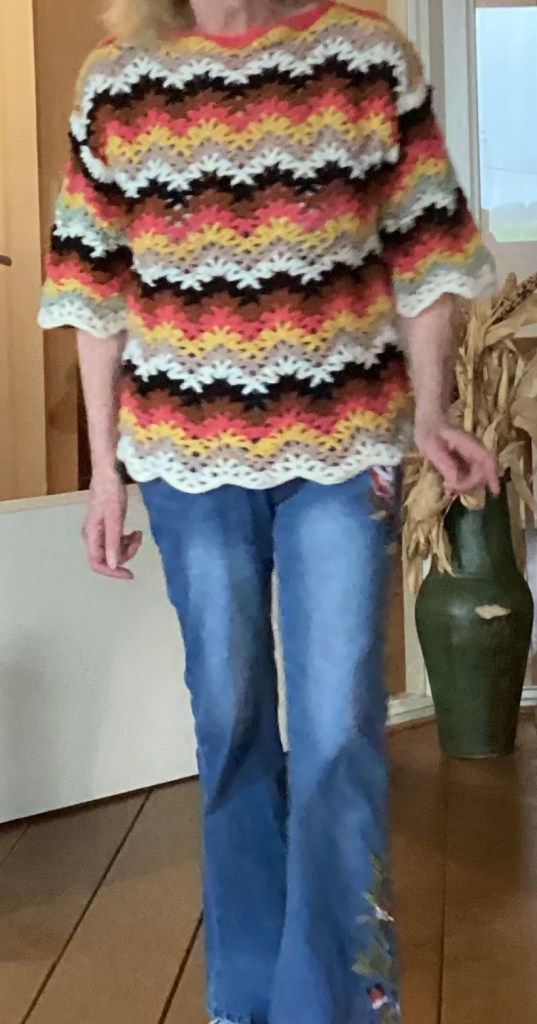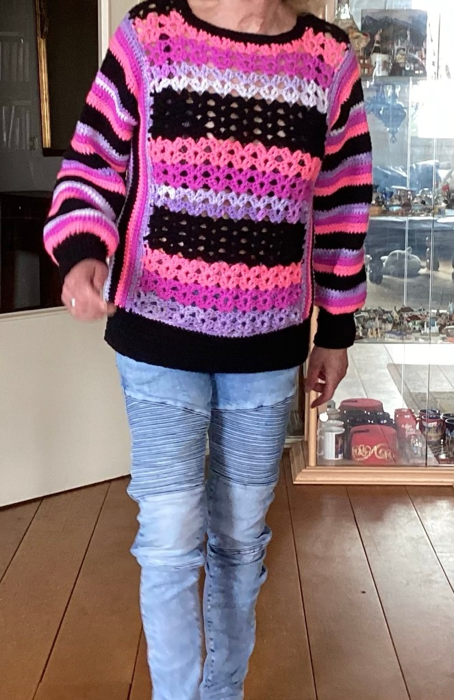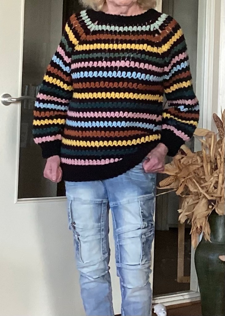 Dit leuke truitje is gehaakt met 6 bollen Royal van de Zeeman op Nld 4,5. Het strepenpatroon ziet er apart uit, maar is helemaal niet moeilijk. Diagram met uitgeschreven toeren staan in het patroon. De maten zijn 36/40 42/46 48/52. Breedte op de rug 52 60 68 cm.