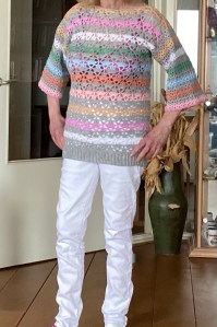 De trui wordt rondgehaakt tot aan de armsgaten. Dit is helemaal niet moeilijk en zorgt ervoor dat de kleuren van het verloopgaren mooi doorlopen van voorpand naar achterpand. En nog een voordeel is dat je geen zijnaden hebt.