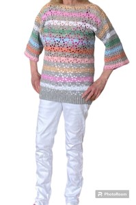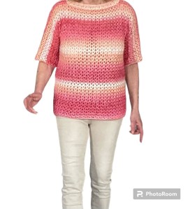 Ik heb dit truitje gehaakt met 6 bollen Supersoft van de Zeeman op Nld 3,5. De maten zijn 36/40 42/46 48/52. Breedte op de rug 50 57 64 cm. Kijk even welke breedte het beste bij jou past. Meet eventueel een trui van jezelf na. Het gaat om de breedte onder de armsgaten. Omdat de trui van boven naar beneden wordt gehaakt kun je de lengte makkelijk zelf bepalen. Ik hou aan ergens tussen de 60 en 65 cm, maar doe je eigen ding.