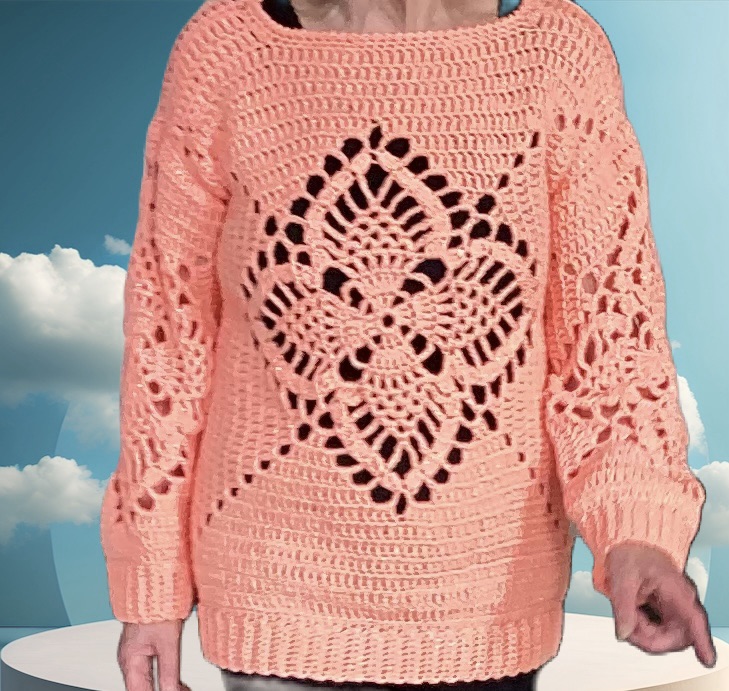 De trui wordt gehaakt rond een diagram. Dat staat in het patroon met uitgeschreven toeren.