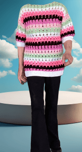 Ik heb deze trui gehaakt met Ella van de Wibra op Nld 4,5. De kleuren zijn heel mooi, maar …. De bollen vallen als de omslag eraf is van ellende in elkaar en raken ook makkelijk in de war. Eerst even opkluwen, scheelt een hoop ergernis.