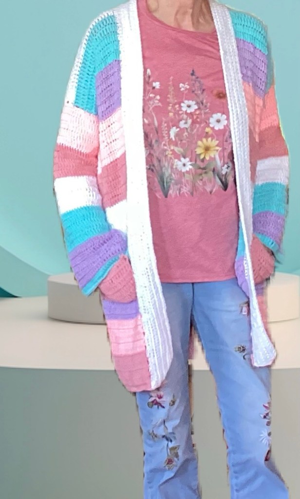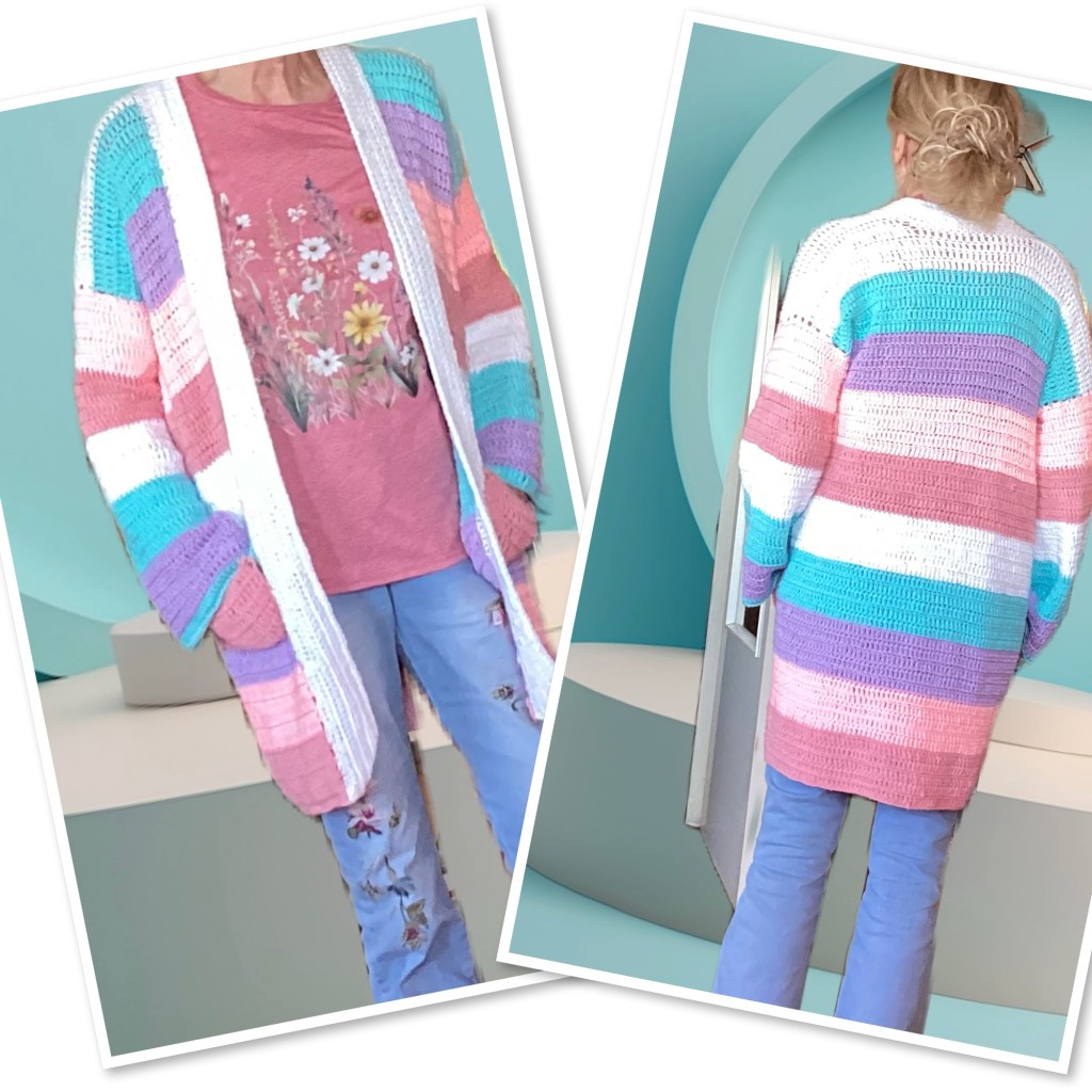 Dit is echt een heel makkelijk patroon. Je haakt bijna alleen stokjes in rechte lappen. De maten zijn 36/38 40/42 44/46. Breedte op de rug ongeveer 50 54 58 cm. Lengte kun je zelf bepalen. Het vest op de foto is 80 cm. Aanbevolen garens zijn Royal (of Royal shine) van de Zeeman, Saskia van de Wibra of acrylgaren van de Action. Je hebt 2 bollen hoofdkleur (bij mij wit) en 4 gekleurde bollen nodig. Haken op Nld 4,5.