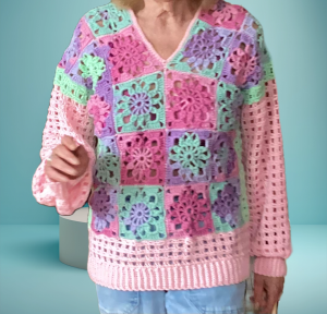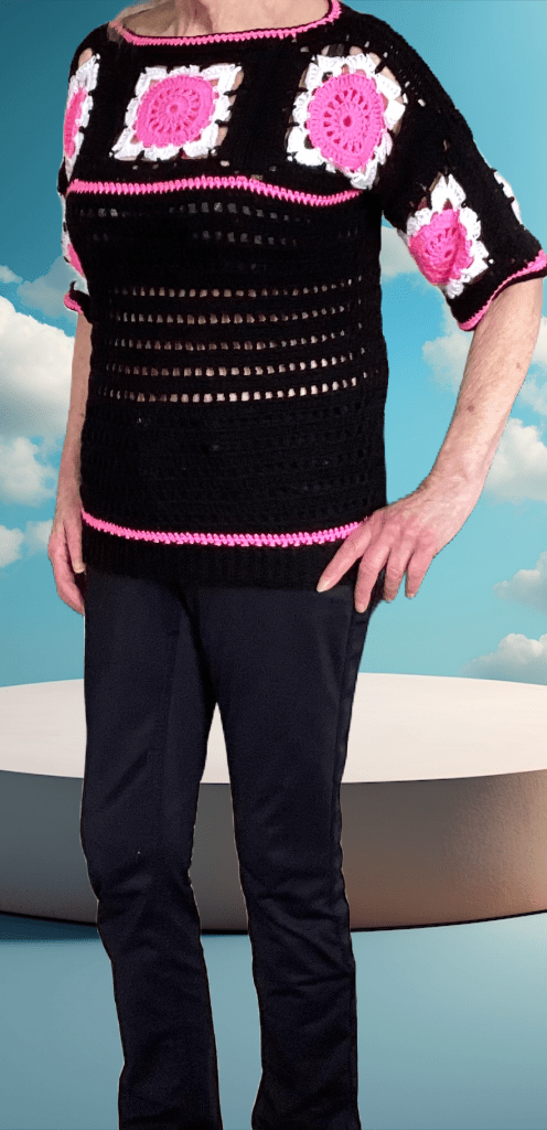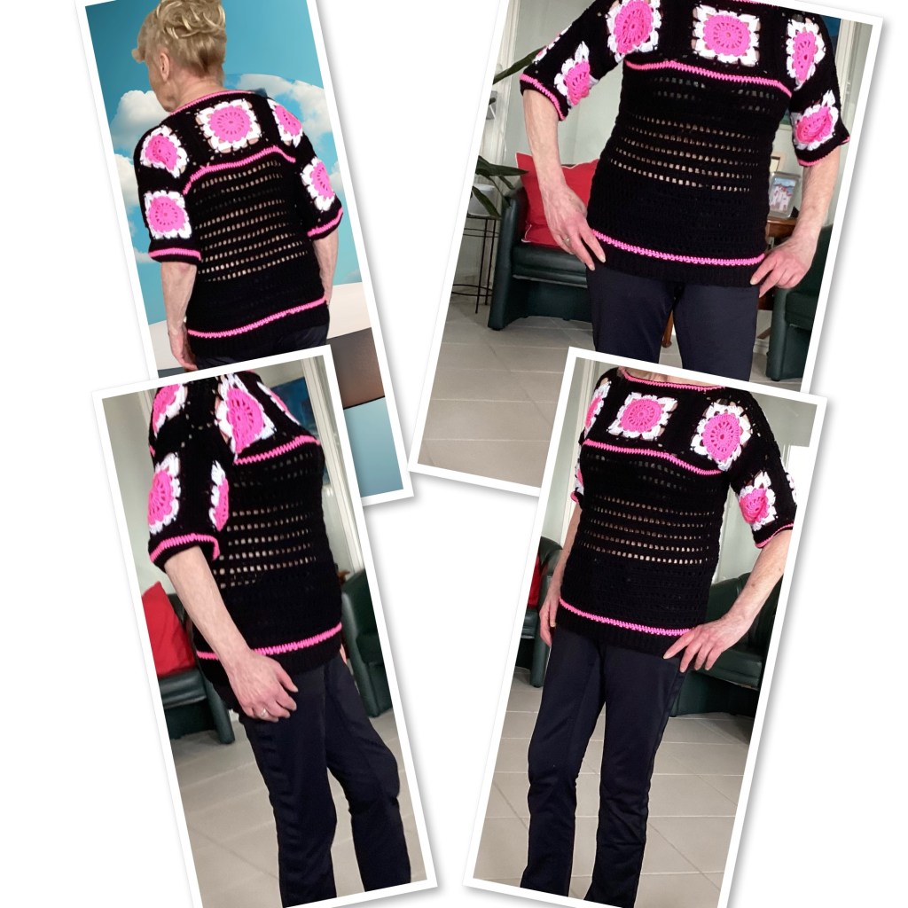 Dit truitje heeft als basis 5 vierkanten per pand en is gemaakt met Supersoft van de Zeeman op Nld 3,5. Je hebt nodig: 4 bollen zwart, 1 bol roze, 1 bol wit. De maten zijn 36/38 40/42 en 44/46. Breedte op de rug ca 51 54 57 cm. Lengte kun je zelf bepalen.