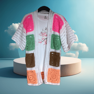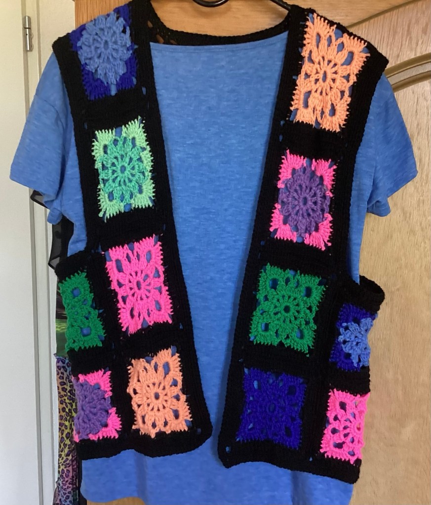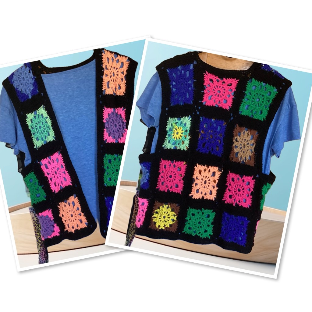 Dit is een heel makkelijk vestje! 24 mooie Grannies haken, aan elkaar zetten, omhaken en klaar. Nu nog leuk met een T-shirt met korte mouwtjes, straks een truitje met lange mouwen.